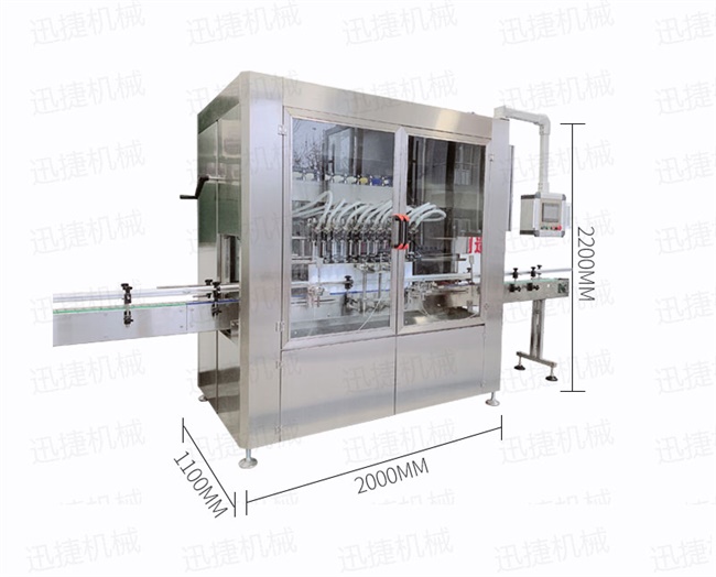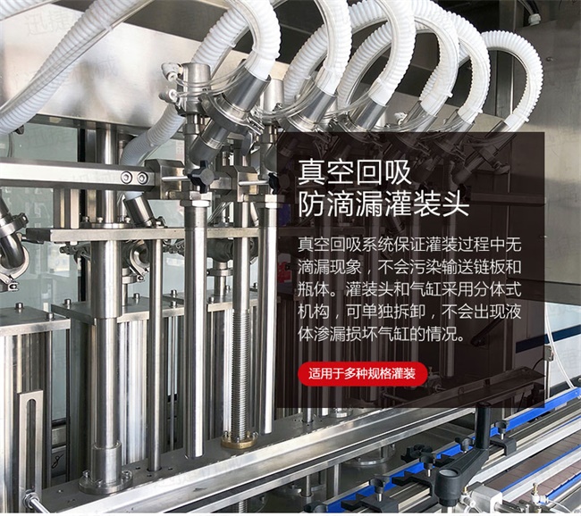 1.真空回吸系統(tǒng)保證灌裝過程中無滴漏現(xiàn)象,不會(huì)污染輸送鏈板和瓶體。灌裝頭和氣缸采用分體式機(jī)構(gòu),可單獨(dú)拆卸,不會(huì)出現(xiàn)液體滲漏損壞氣缸的情況。進(jìn)口亞德客氣缸經(jīng)久耐用,其他密封等配件使用標(biāo)準(zhǔn)件,更換維護(hù)簡單方便。