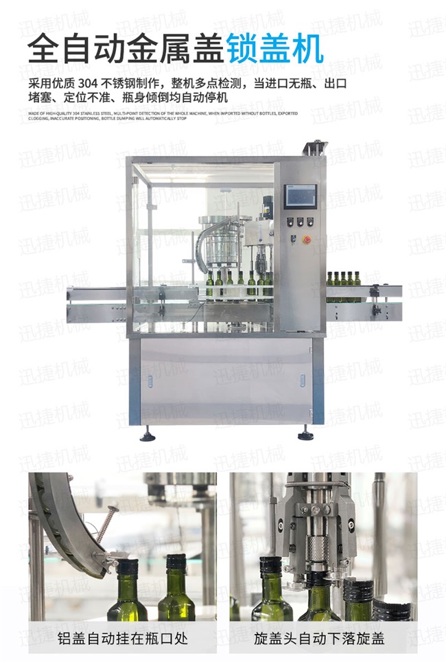 5、整機(jī)多點(diǎn)檢測,當(dāng)進(jìn)口無瓶、出口堵塞、定位不準(zhǔn)、瓶身傾倒均自動(dòng)停機(jī)。