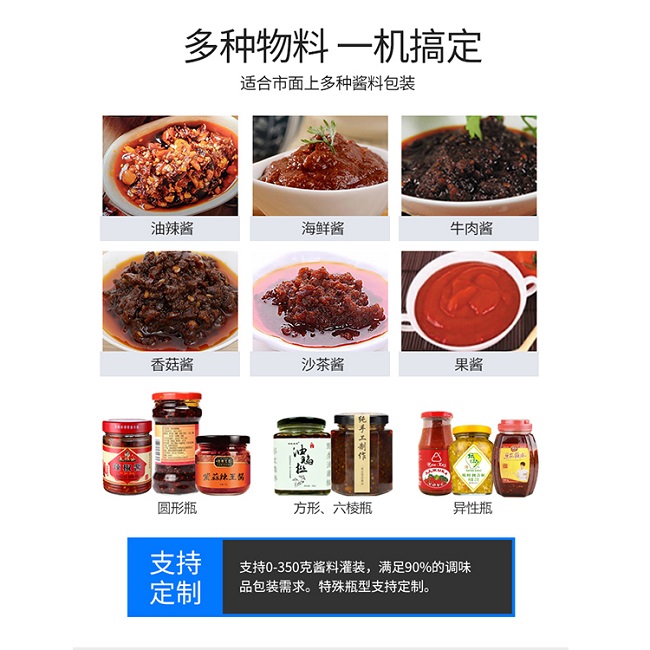 牛肉醬灌裝機采用活塞式氣缸氣動原理,適用于調(diào)味品中帶顆粒并且濃度較大的香菇醬、辣椒醬、豆瓣醬、花生醬、芝麻醬、果醬、牛油火鍋底料、紅油火鍋底料等較為粘稠醬類的灌裝。灌裝轉閥可以很具客戶物料定做加大,以適應不同客戶物料的灌裝需求。